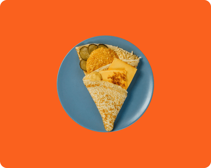 сыр российский, котлета куриная, соус сырный, сыр чеддер, соленые огурцы, лук фри