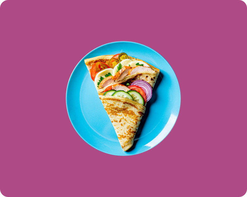Буженина из курицы, сыр моцарелла, белый соус, огурцы, помидоры, красный лук, перец халапеньо, зелень