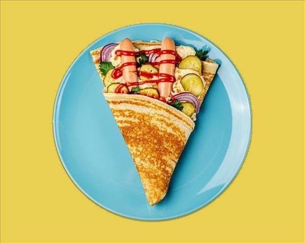 Картофельное пюре, сосиска, соленые огурцы, красный лук, кетчуп, лук фри, зелень